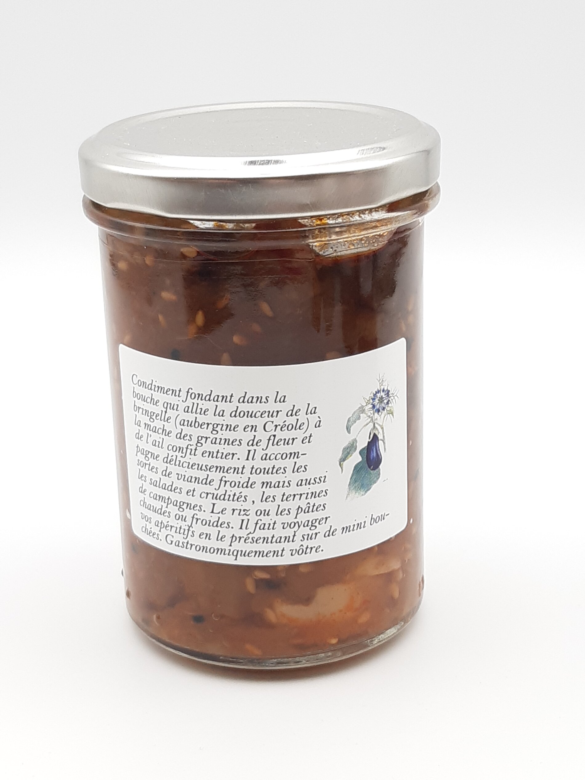 Condiment fondant dans la bouche qui allie la douceur de la Bringelle (aubergine en créole) à la mâche des graines de fleurs (graines de Nigelle et de Sésame ) et de l'ail confit entier.